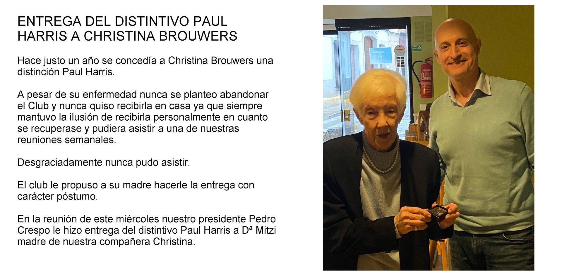 Christina fue una compañera extraordinaria que a los pocos meses de entrar en nuestro Club ya conocía perfectamente el funcionamiento del Rotary a nivel del Club y del distrito. Siempre fue una compañera muy dedicada y trabajadora que daba importancia a todas las iniciativas dentro del Club.